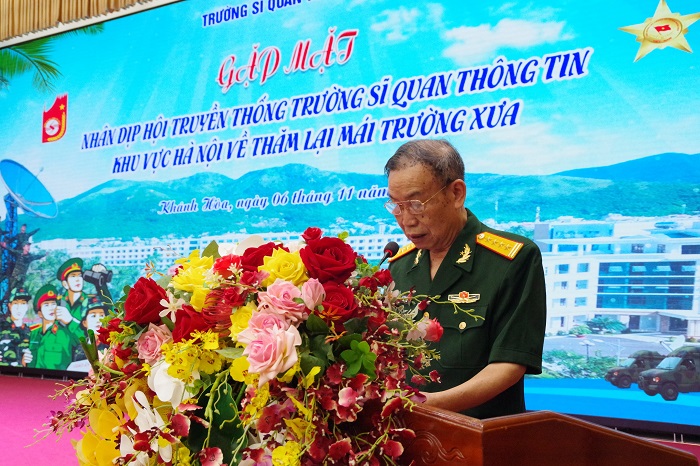 Phát biểu tại buổi gặp mặt, đồng chí Hiệu trưởng Nhà trường bày tỏ vui mừng, xúc động khi được đón các thế hệ cán bộ, giảng viên, nhân viên, học viên trở lại thăm trường - nơi từng gắn bó, cống hiến một phần tuổi trẻ, tâm huyết cho sự nghiệp đào tạo sĩ quan thông tin cho Quân đội. Đồng chí Hiệu trưởng Nhà trường khẳng định: Trải qua 74 năm xây dựng và phát triển, các thế hệ cán bộ, giảng viên, nhân viên, học viên, chiến sĩ Trường Sĩ quan Thông tin đã không ngừng phát huy truyền thống “Chủ động, sáng tạo; Đoàn kết, kỷ luật; Vượt khó vươn lên; Làm chủ kỹ thuật; Dạy tốt, học tốt”, góp phần quan trọng vào sự nghiệp xây dựng Quân đội nhân dân Việt Nam cách mạng, chính quy, tinh nhuệ, từng bước hiện đại.